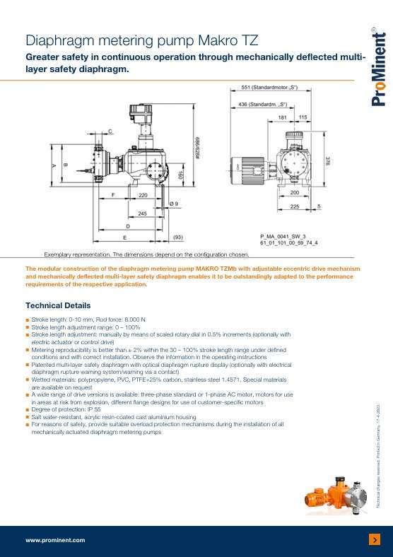 The modular design of the MAKRO TZMb diaphragm metering pump with adjustable eccentric drive mechanism and mechanically deflected multi-layer safety diaphragm allows it to be uniquely adapted to the performance requirements of the respective application.